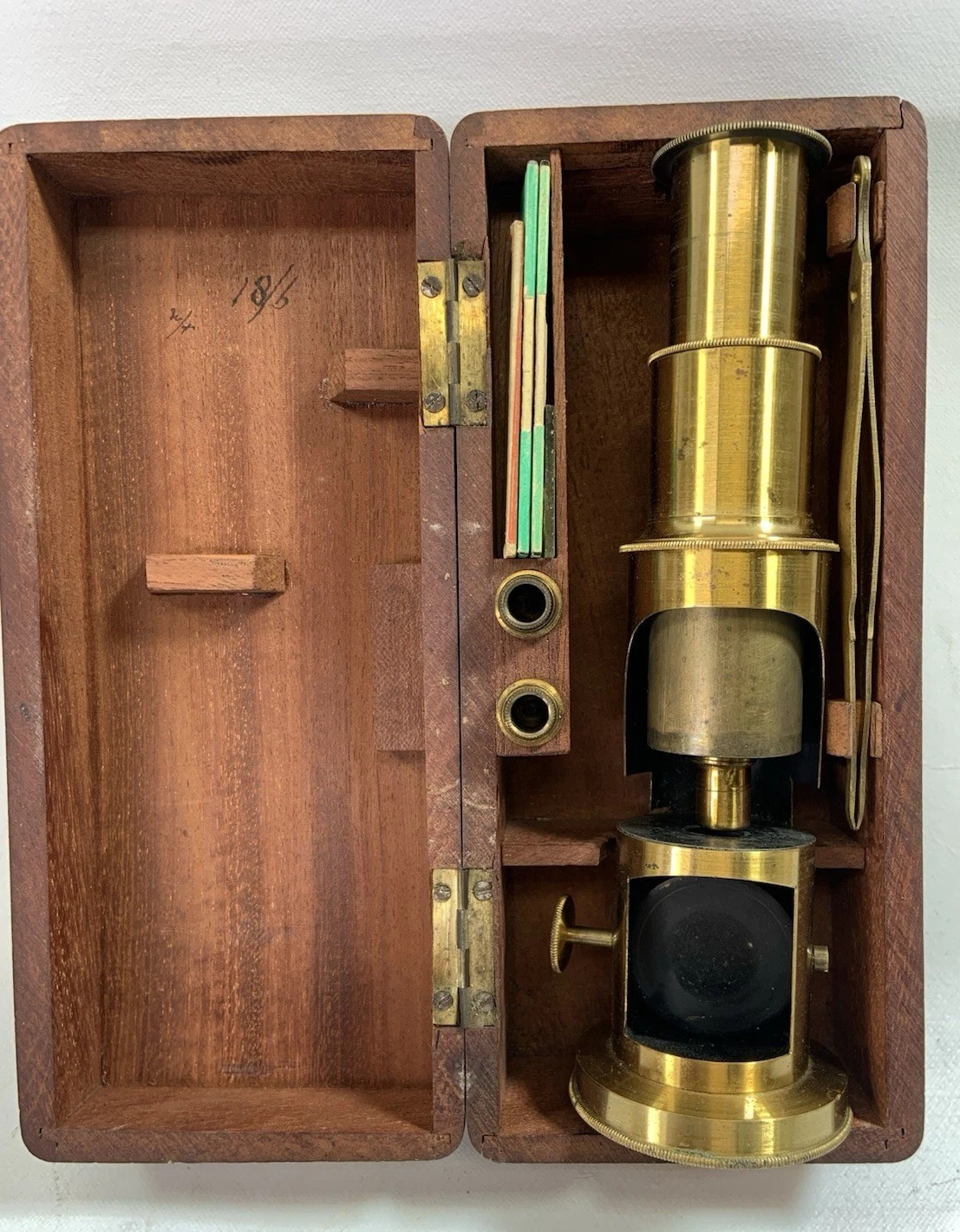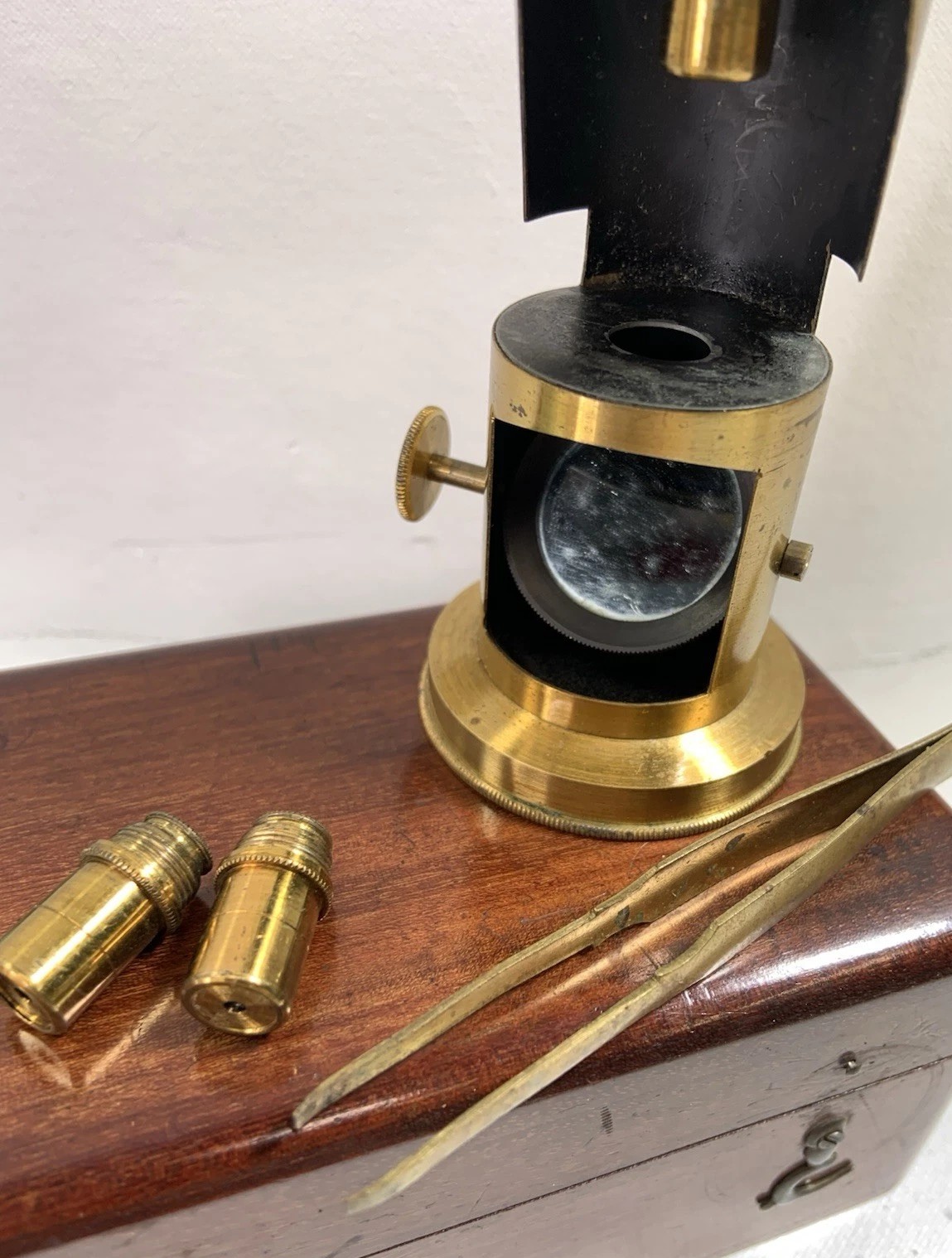 Microscope has its original eyepiece and two separate brass screw in objectives. Draw tube focus, works well nice clean images for its age. Height about 20 cm when drawn to focus.