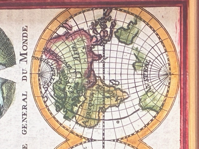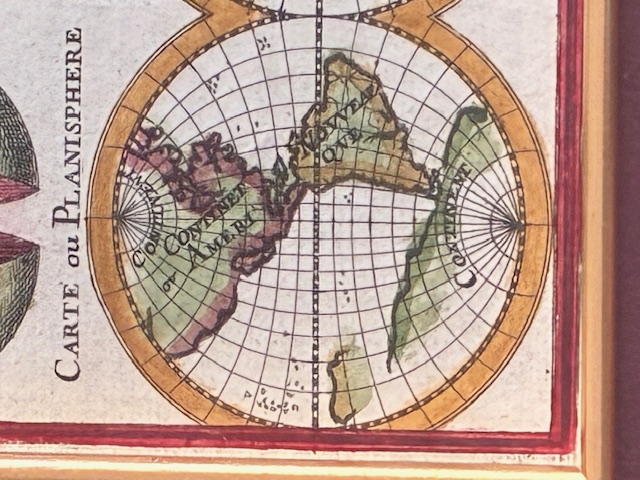 An unusual original copper engraving from 1683. A depiction of a hemisphere with the Atlantic at the centre so partly Old and New World. Below that the segmented opposite view with the distinct shape of the northern coastline of Australia and then Planisphere of the East and West hemispheres in the style of d’Arzael with the unusual blob shape in the position of Australia.