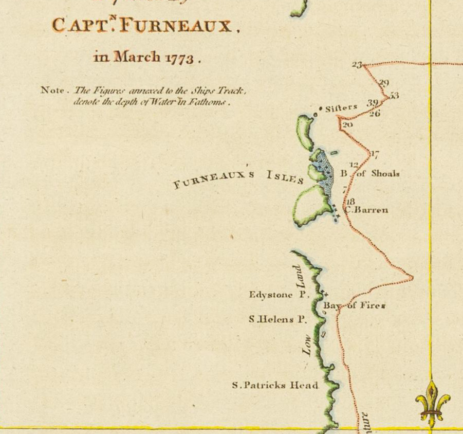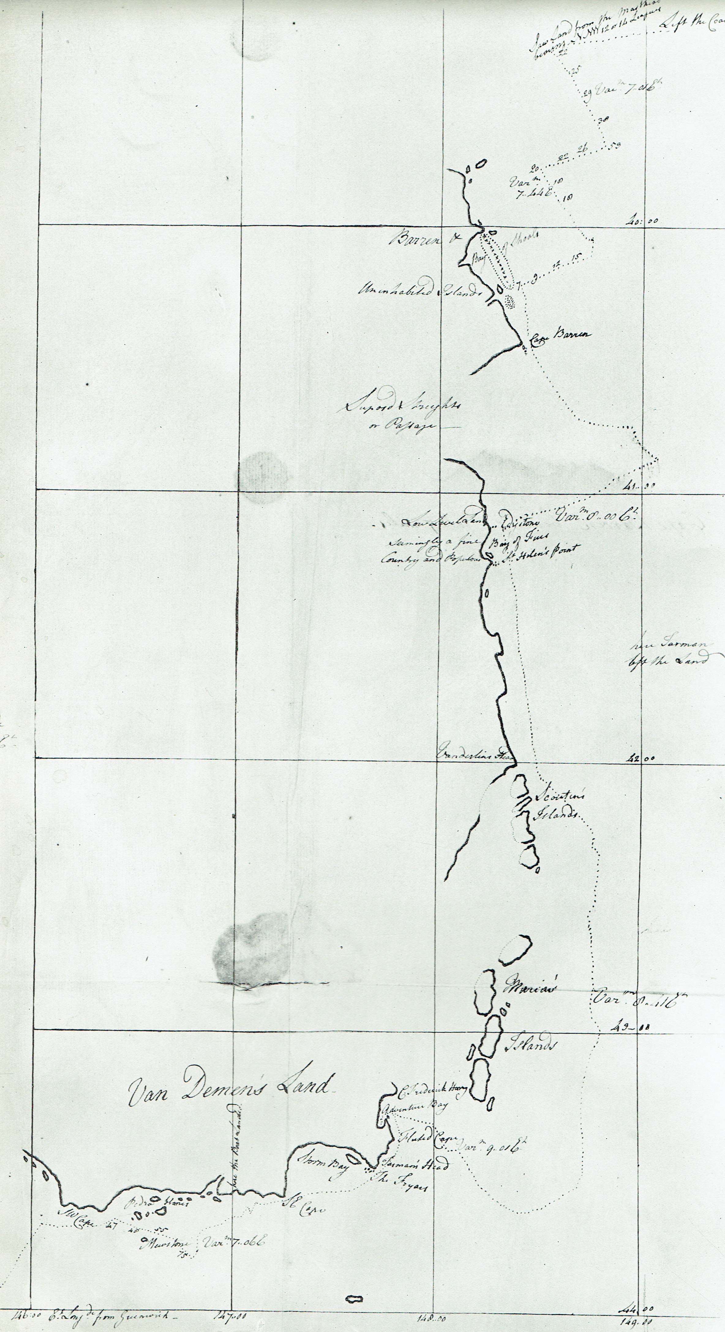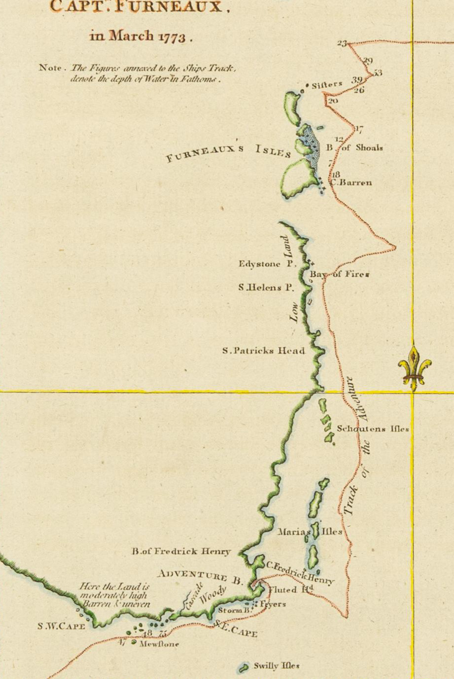 Furneaux discovered Adventure Bay on Bruny Island and then sailed north along the east coast naming many landmarks including the Furneaux Islands. He was suspicious of open water to the west but weather and other considerations made him press east to meet Cook without confirming what we now know as Bass Strait.