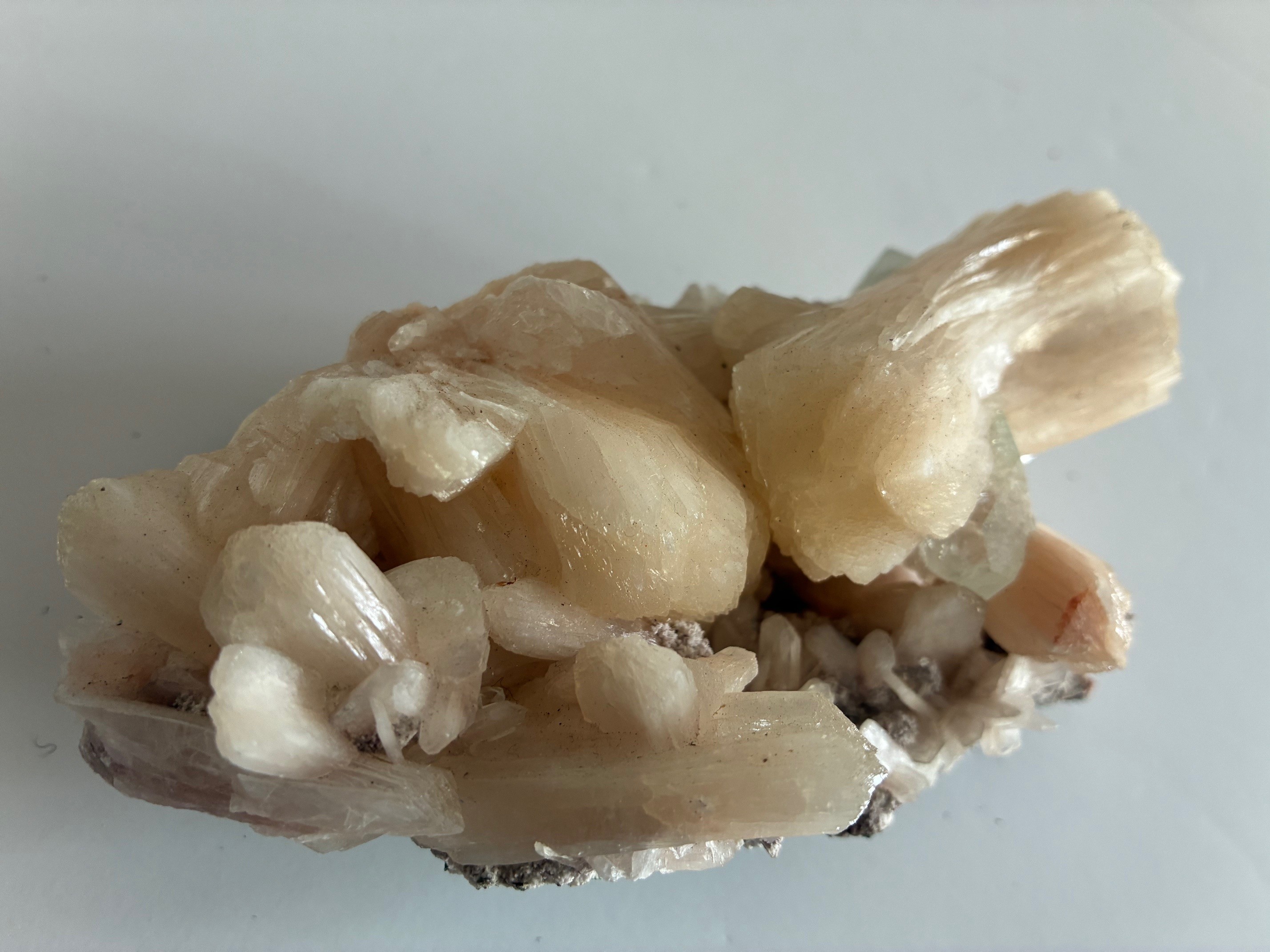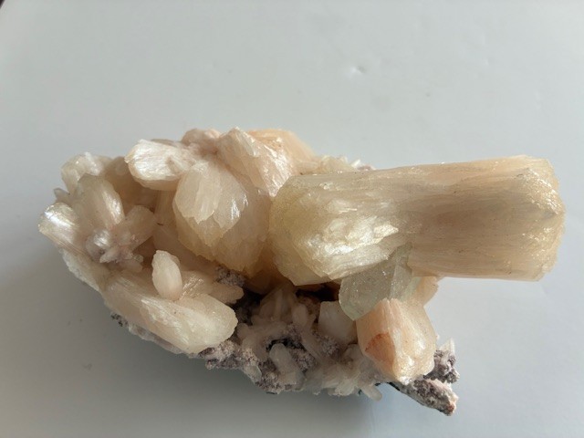 This example is characteristic of it’s found location [it takes various forms in different parts of the World – Iceland, Scotland etc]. Here we have a peach/ pink hue and a translucent characteristic. The large form is often described as a “bow tie” and you can see why. This is a particularly good example with larger forms sitting on a bed of crystals on the host structure.