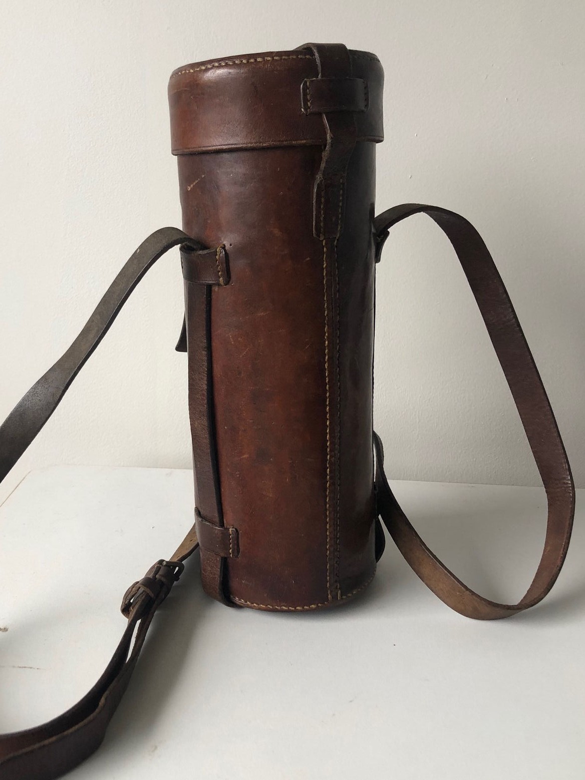 The item is in great condition. The full leather casing is 25cm by 10cm, stitching perfect – nicely embossed with McCracken’s details. The copper thermos has a ding but is a solid actually useable item. The screw on top is undamaged and goes on and off easily.
